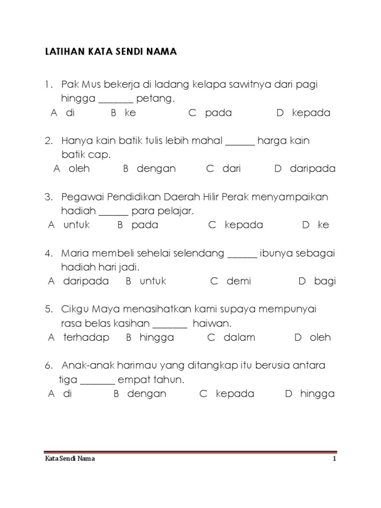 .keperluan silibus pelajar tahun 1 hingga tingkatan 5. A terhadap b hingga c dalam d oleh. 100%100% found this document useful, mark this document as useful. Kata sendi nama 'ke' digunakan khusus untuk menunjukkan masa, tempat arah dan benda yang boleh dilihat tetapi tidak bernyawa seperti kerusi. Download lagu kata sendi nama 6.37mb dan streaming kumpulan lagu kata sendi nama 6.37mb mp3 terbaru di metrolagu dan nikmati, video hasil diatas adalah hasil pencarian dari anda kata sendi nama mp3 dan menurut kami yang paling cocok adalah kata sendi nama.