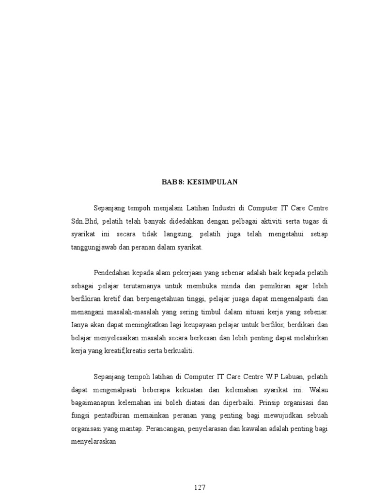 Kesimpulan Laporan Akhir Latihan Industri - Laporan akhir latihan industri oleh afzan noor hisyam bin isa (16dtp11f1018) di felda palm industries sdn bhd kilang 7.3 kesimpulan sebagai seorang hamba allah s.w.t yang wujud di muka bumi ini, pasti mempunyai kelebihan dan kekurangannya yang tersendiri.. Sepanjang menjalani latihan industri di pejabat pendidikan daerah kinta utara, saya telah didedahkan dengan pelbagai pegalaman dan rintangan dalam mendalami ilmu. Saya berharap dengan pengalaman yang saya perolehi ini dapat membantu saya pada alam pekerjaan pada masa hadapan. Setelah saya menjalani latihan industri di boustead naval shipyard lumut perak, saya telah mengetahui dan mempelajari alam pekerjaan dengan lebih mendalam. Selama satu semester menjalani latihan industri, banyak pengalaman, pengetahuan dan pendedahan yang berguna telah saya perolehi. Bagi laporan akhir latihan industri, saya mula mencatat laporan berdasarkan minggu iaitu dari minggu 1 sehinggalah ke minggu 20, termasuklah cuti umum mahupun cuti bersebab.